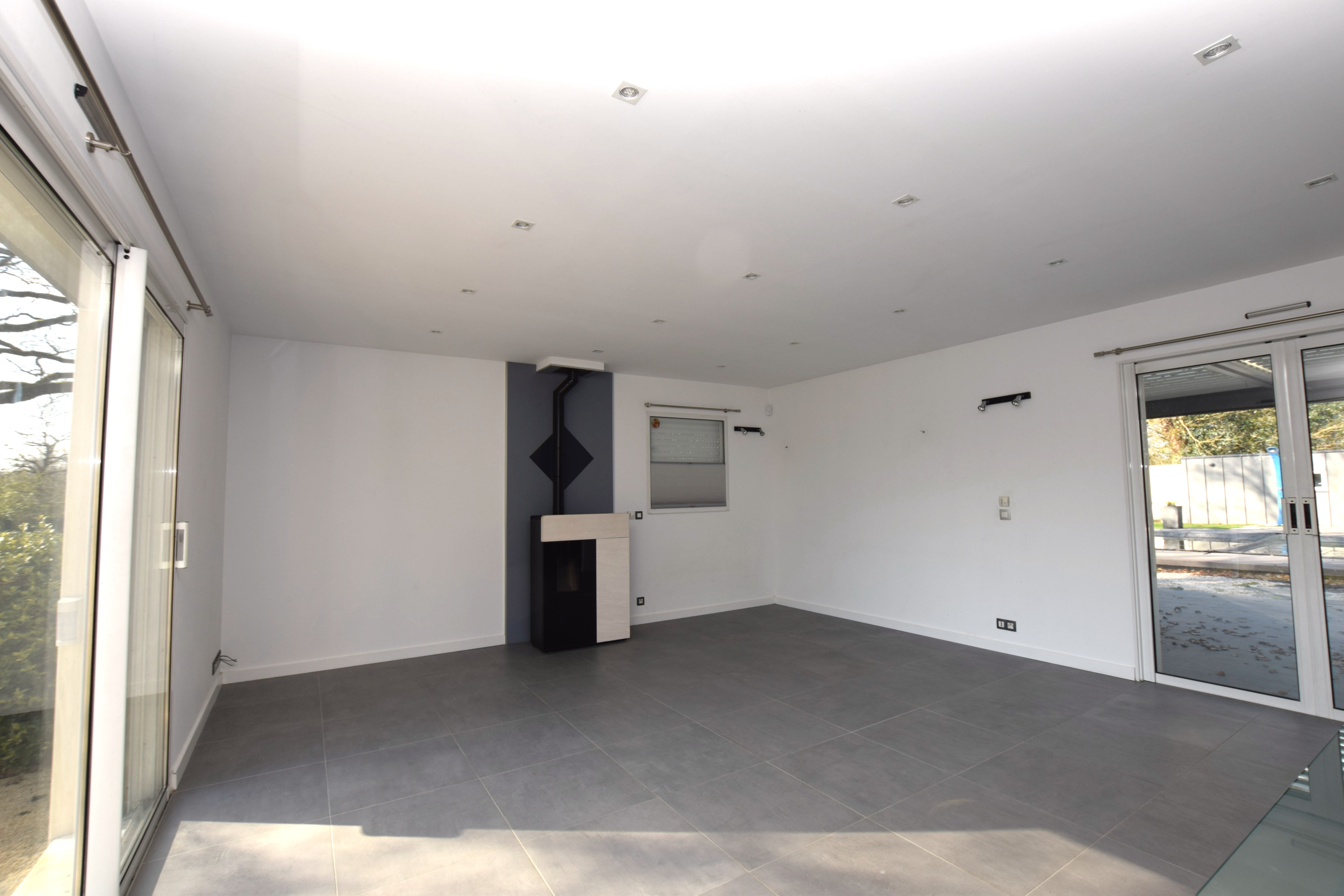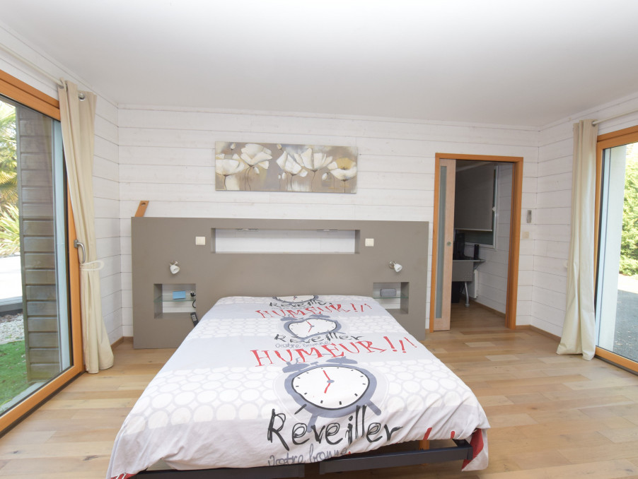 Au rez-de-chaussée : Un séjour lumineux avec poêle à granulés, une grande cuisine aménagée et équipée avec arrière-cuisine attenante, et deux chambres dont une suite parentale avec bureau attenant. Toutes les pièces du rez-de-chaussée offrent une vue imprenable sur la piscine.