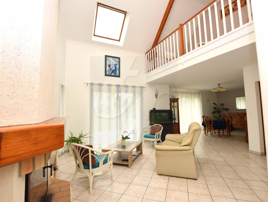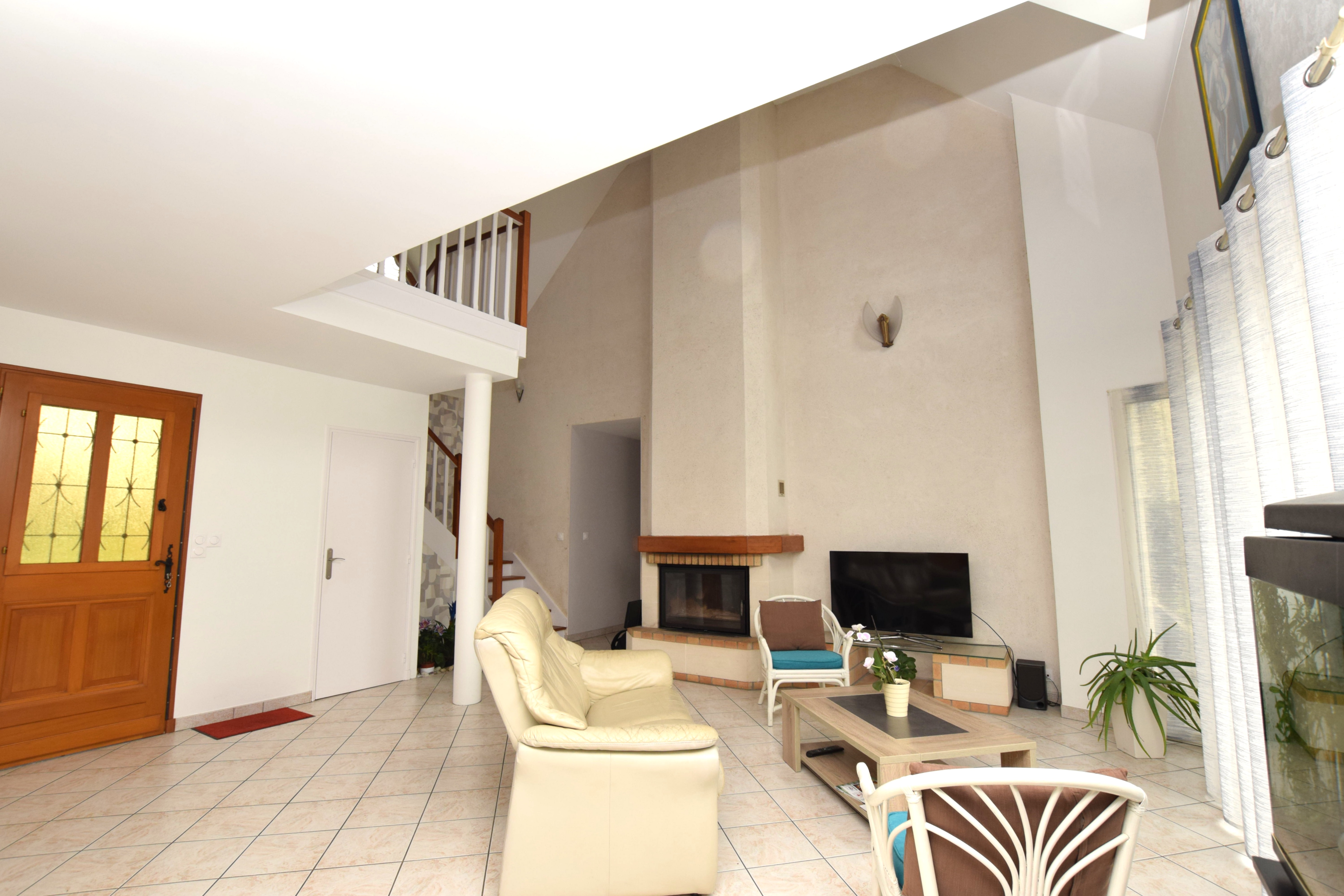 À l’intérieur, l’espace de vie séduit immédiatement avec sa belle hauteur sous plafond et sa cheminée avec insert qui apporte chaleur et charme authentique.