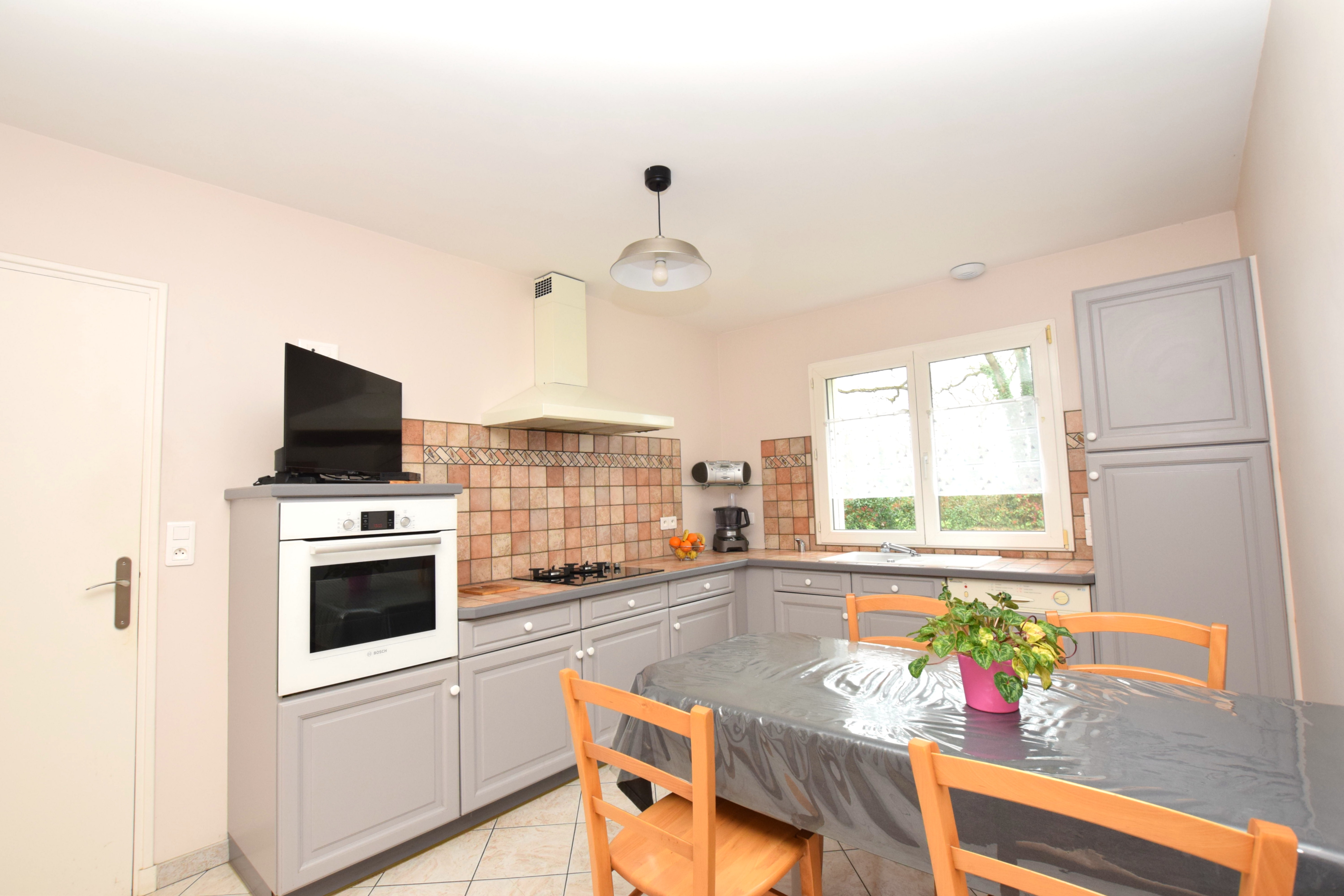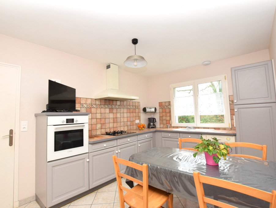 La cuisine équipée et aménagée est attenante et fermée. Une arrière-cuisine / buanderie complète cet espace fonctionnel.