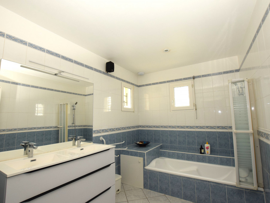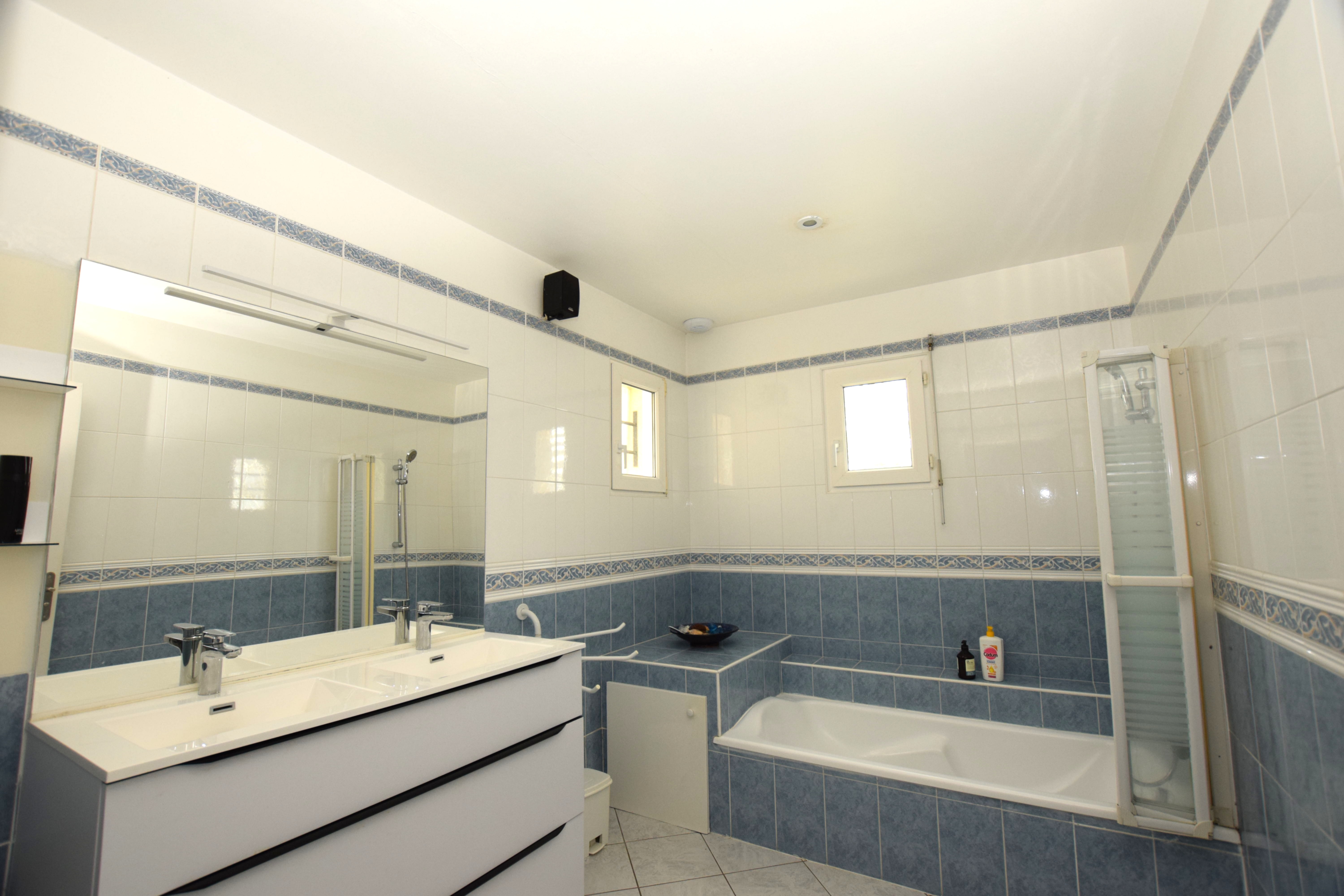 La maison propose trois belles chambres de plain-pied, toutes spacieuses et lumineuses, une grande salle de bains est équipée d'un meuble deux vasques et d’une baignoire confortable. Un WC indépendant vient parfaire le confort du rez-de-chaussée.